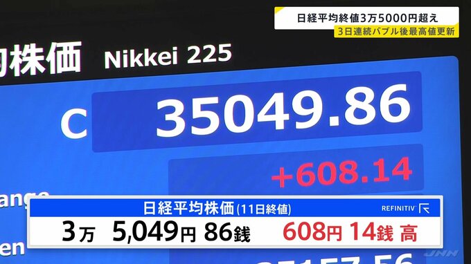きょうの東京株式市場で、日経平均株価の終値は大台の3万5000円を超え、3日連続でバブル後の最高値を更新しました。日経平均株価の終値は、きのうより608円高い3万5049円でした。終値が大台の3万5000円を上回るのは…
