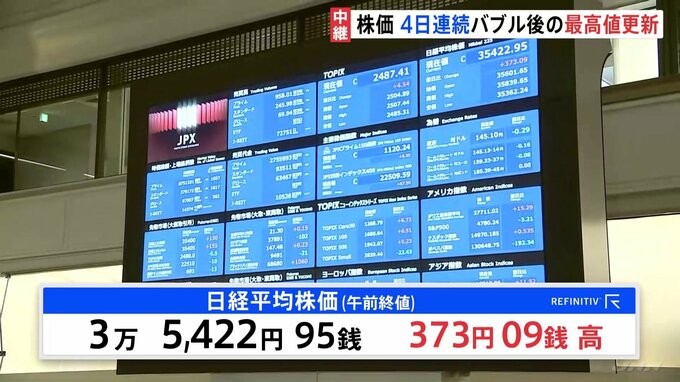 株価の上昇が止まりません。きょうの日経平均株価は一時、700円以上値上がりし、取引時間中として4日続けてバブル崩壊後の最高値を更新しました。買いが買いを呼ぶ展開となっています。きょうの日経平均株価は取引…