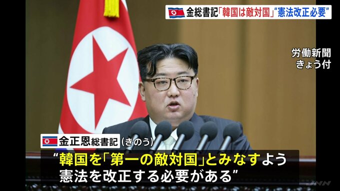 北朝鮮の金正恩総書記がきのう、立法機関にあたる最高人民会議で演説し、韓国を「第一の敵対国」とみなすよう憲法を改正する必要があると訴え、韓国との対決姿勢を強調しました。北朝鮮メディアが報じました。これ…