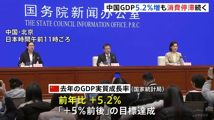 中国政府はさきほど、去年1年間のGDP=国内総生産の実質成長率について、プラス5.2%だったと正式に発表しました。目標を達成したとしています。中国政府の発表によりますと、去年のGDPの実質成長率は前の年と比べ…