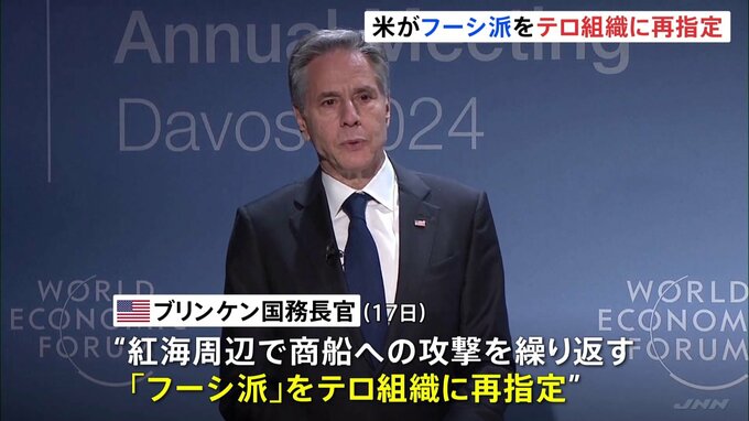 アメリカ政府はハマスに連帯を示すイエメンの武装組織「フーシ派」をテロ組織に再指定すると発表、新たな攻撃も実施しました。アメリカのブリンケン国務長官は17日、紅海周辺で商船への攻撃を繰り返す「フーシ派」…