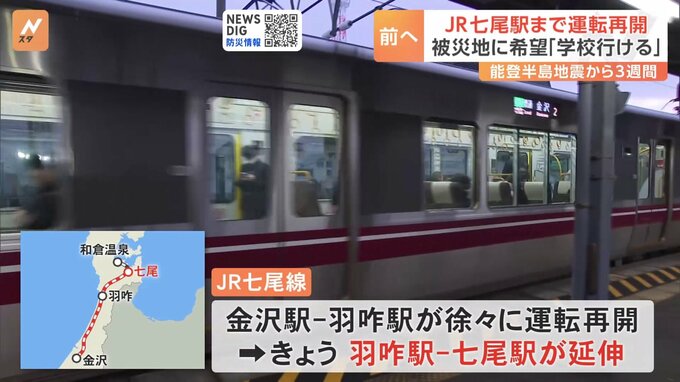 能登半島地震から3週間。被災地には前向きな変化も起きています。金沢方面からの列車が、きょう、七尾駅までの運転を再開し、観光地、和倉温泉の1駅手前までの足がようやく確保されました。地震の影響で運休が続い…
