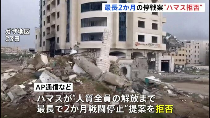 パレスチナ自治区ガザでの最長2か月の戦闘停止などを含むイスラエル側の提案を、イスラム組織ハマスが拒否したと複数のメディアが報じました。AP通信などは、ハマスが「人質全員が解放されるまで最長で2か月戦闘を…
