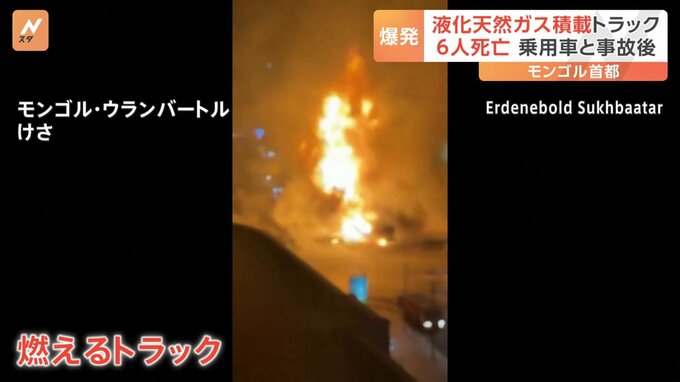 モンゴルの首都ウランバートルで、ガスを積んだトラックが大爆発。6人が死亡しました。路上で激しく燃えるトラック。次の瞬間、突然、爆発を起こしました。瞬く間に炎と煙が広がります。現地当局によりますと、ト…