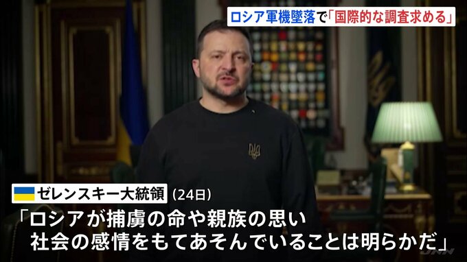 ウクライナ国境に近いロシア西部で軍の輸送機が墜落し、乗っていたウクライナ人の捕虜が死亡したとされることについて、ウクライナのゼレンスキー大統領は墜落に関与したかについては触れず、「国際的な調査を求め…