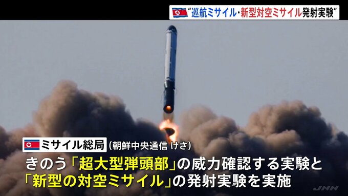 北朝鮮は、ミサイル総局がきのう、巡航ミサイルの「超大型弾頭部」の威力を確認する実験と「新型対空ミサイル」の発射実験を行ったと明らかにしました。北朝鮮の朝鮮中央通信は、けさ、ミサイル総局のスポークスマ…