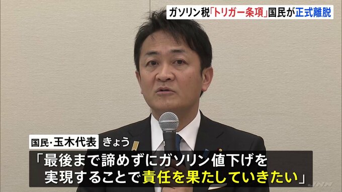 国民民主党はさきほど、ガソリン税の「トリガー条項」をめぐる与党との協議から離脱することを正式に決めました。国民民主党はきょう午後、両院議員総会を開き、ガソリン税の一部を引き下げる「トリガー条項」につ…