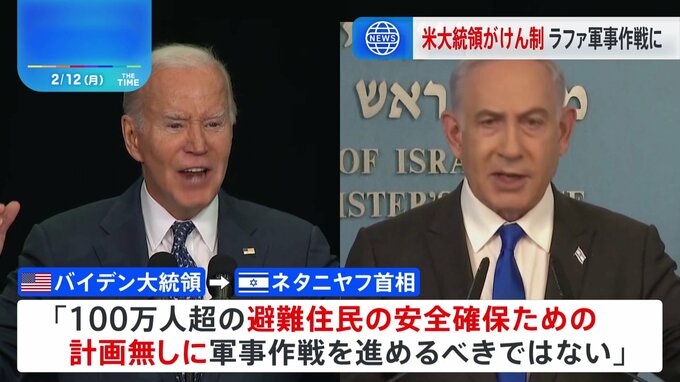 アメリカのバイデン大統領は11日イスラエルのネタニヤフ首相と電話会談し、パレスチナ自治区ガザ南部のラファでの軍事作戦について、「避難住民の安全を確保しない限り進めるべきではない」との考えを伝えました。…