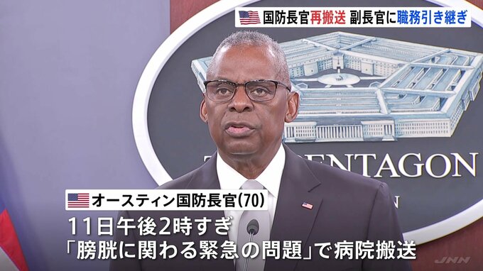 先月、がんの手術に伴う合併症により救急搬送されたアメリカのオースティン国防長官が、また緊急入院しました。アメリカの国防総省によりますと、オースティン国防長官は現地11日午後2時すぎ、「膀胱に関わる緊急…