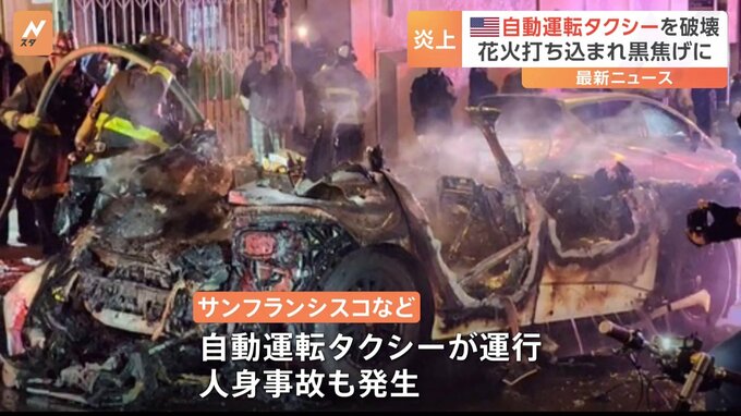 アメリカ西部サンフランシスコで完全自動運転のタクシーが群衆に破壊され、炎上しました。車を取り囲む人たち。一人はスケートボードを使って窓をたたき割っています。春節を祝うサンフランシスコの中華街で撮影さ…