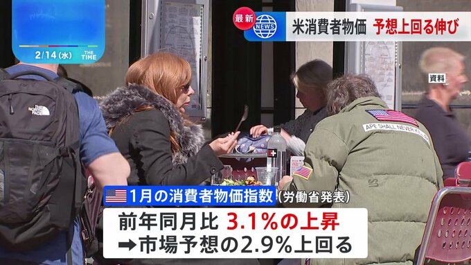 アメリカの1月の消費者物価の伸び率は3.1%で、市場予想を上回りました。FRB=連邦準備制度理事会による利下げの開始が遅れるという見方が広がっています。アメリカ労働省が発表した1月の消費者物価指数は、前の年…