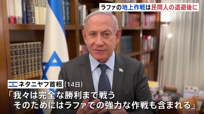 パレスチナ自治区・ガザに侵攻を続けるイスラエルのネタニヤフ首相は、多くの市民が避難する南部ラファでの地上作戦について、民間人の退避後に行う意向を示しました。ネタニヤフ首相は14日、自身のSNSを更新し、…
