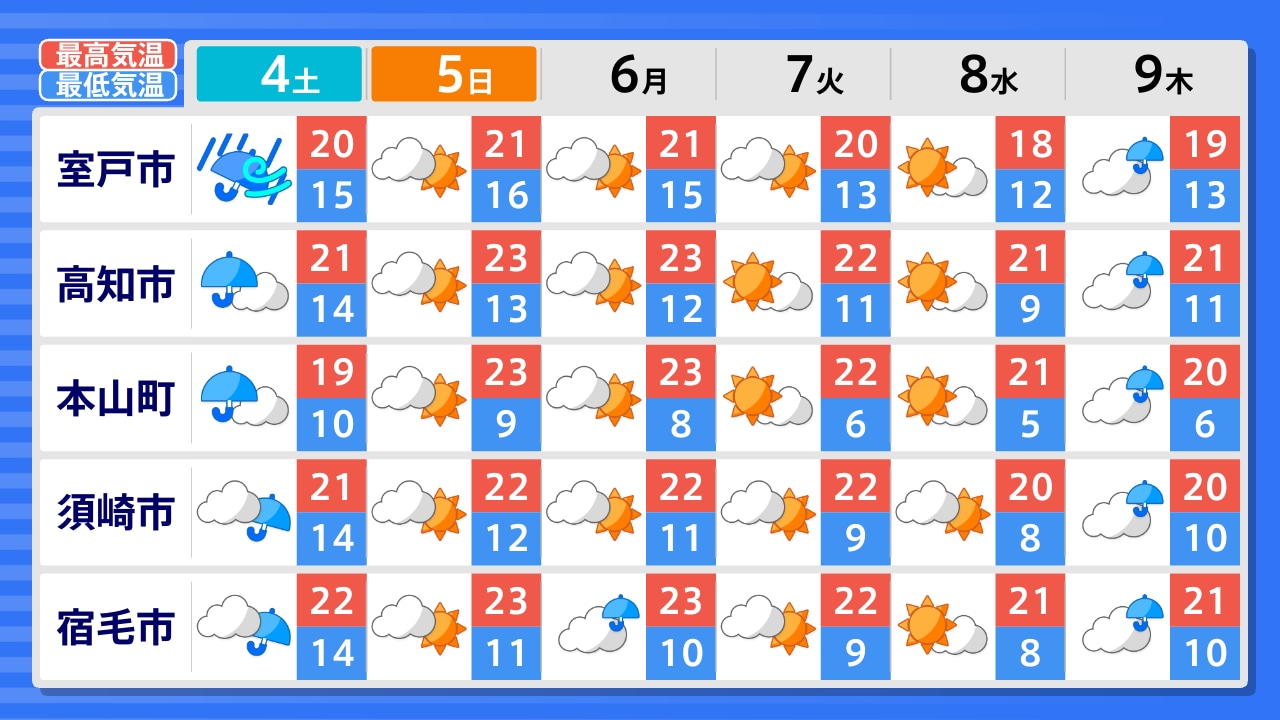 梼原町 四万十町 宿毛市 土佐清水市 須崎市 本山町 高知市 安芸市 馬路村 室戸市