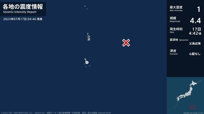 鹿児島県で最大震度1の地震 鹿児島県・鹿児島十島村