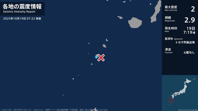 鹿児島県で最大震度1の地震 鹿児島県・鹿児島十島村