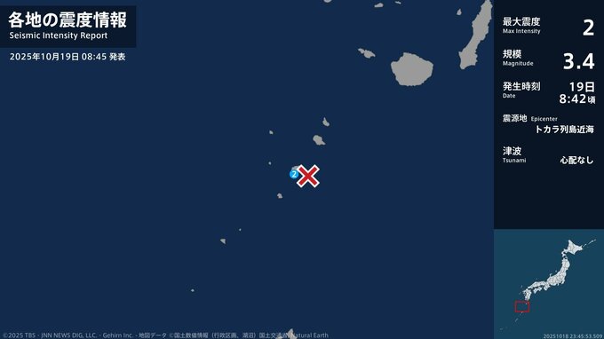 鹿児島県で最大震度1の地震 鹿児島県・鹿児島十島村