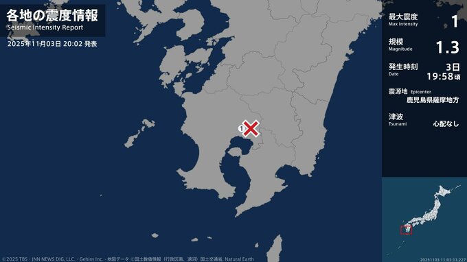 震度1 鹿児島県薩摩地方 19:58ごろ