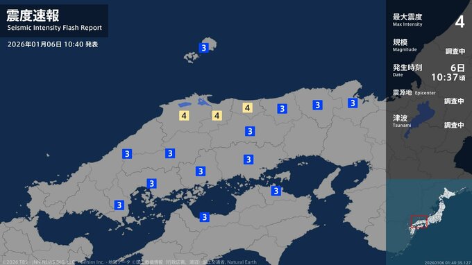 鳥取県、島根県で最大震度3の地震 鳥取県・米子市、島根県・安来市
