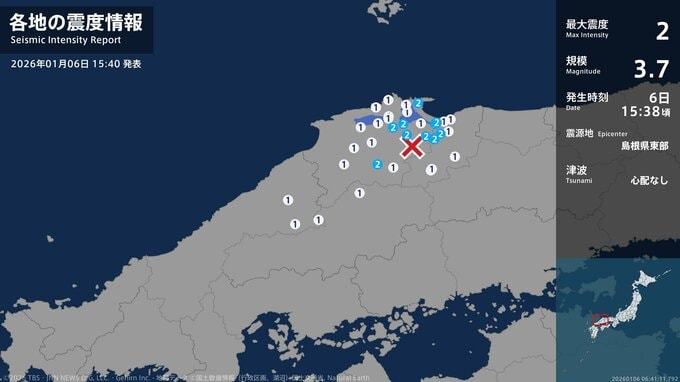震度2 島根県東部 15:38ごろ
