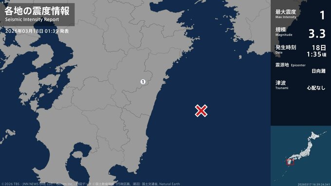 宮崎県で最大震度1の地震 宮崎県・宮崎美郷町