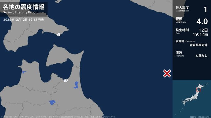 北海道、青森県で最大震度1の地震 北海道・函館市、青森県・野辺地町