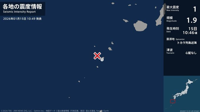 鹿児島県で最大震度1の地震 鹿児島県・鹿児島十島村