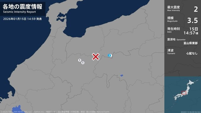 【地震相次ぐ】富山・長野・岐阜で地震頻発 午後2時57分にも震度2を観測 午後2時台で4回目
