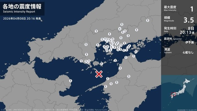 広島県、山口県、愛媛県、大分県で最大震度1の地震 マグニチュードは3.5と推定 震源地は伊予灘 津波の心配なし