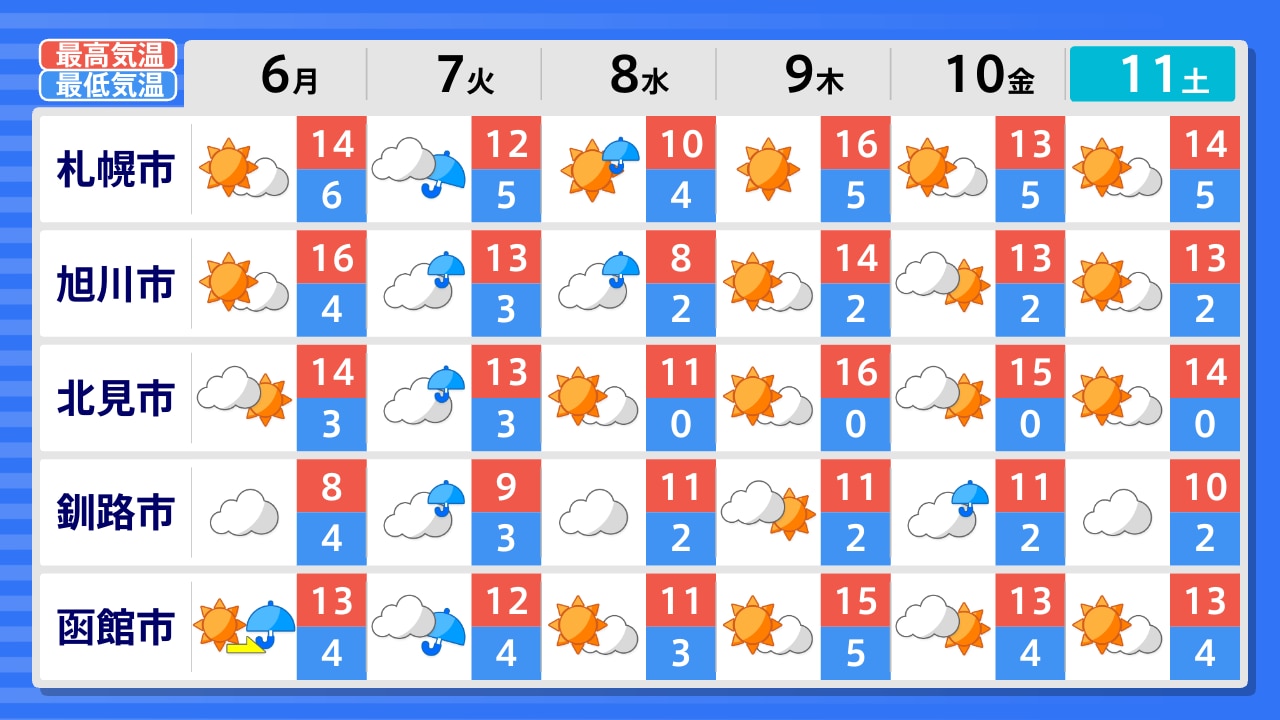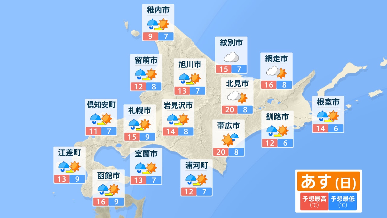 稚内市 留萌市 旭川市 紋別市 網走市 北見市 釧路市 帯広市 根室市 岩見沢市 札幌市 倶知安町 浦河町 室蘭市 函館市 江差町