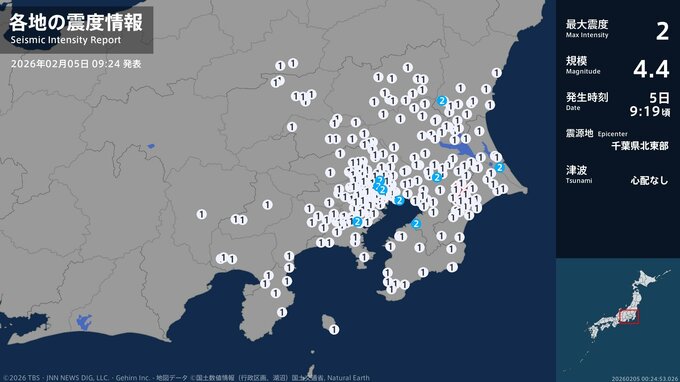 震度2 千葉県北東部 09:19ごろ