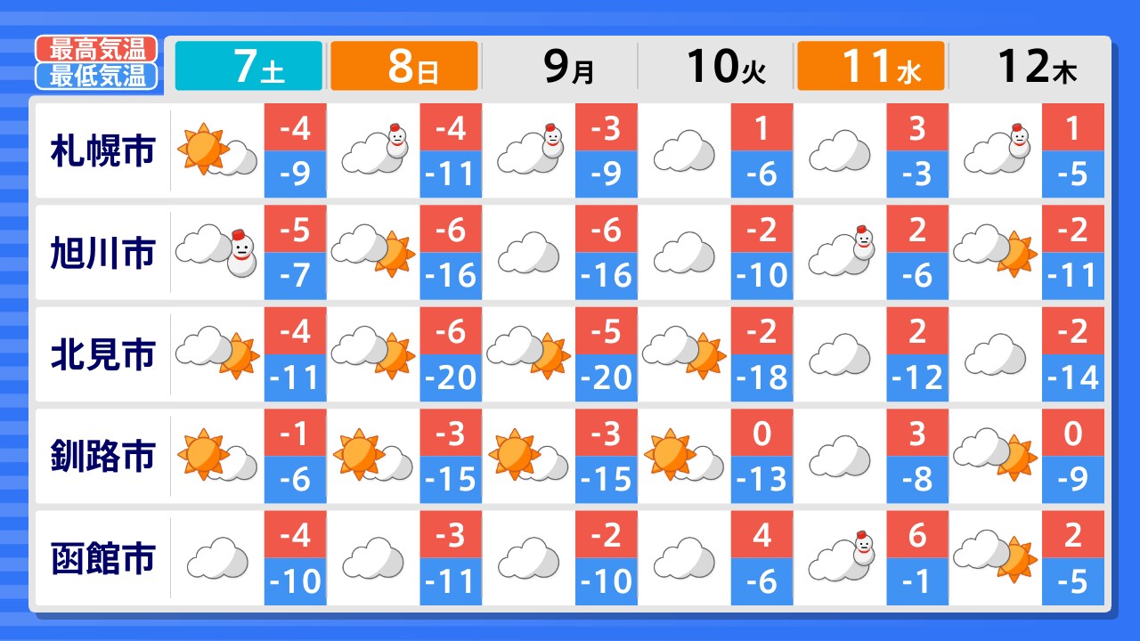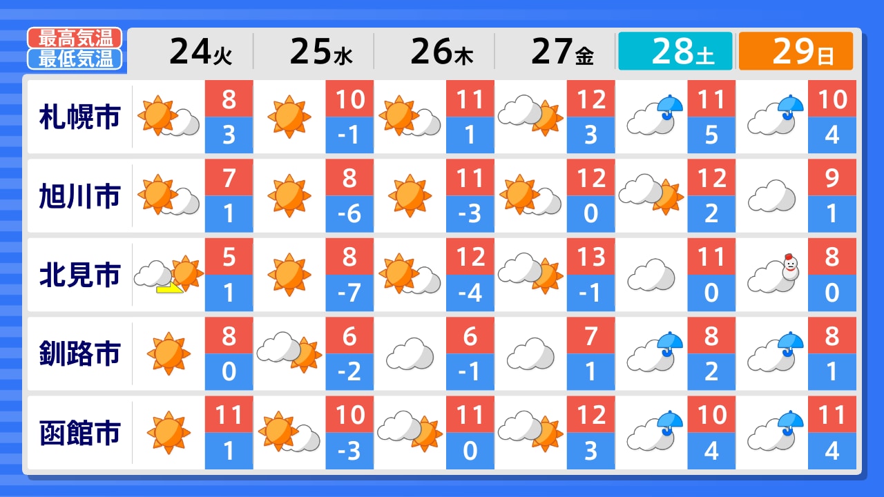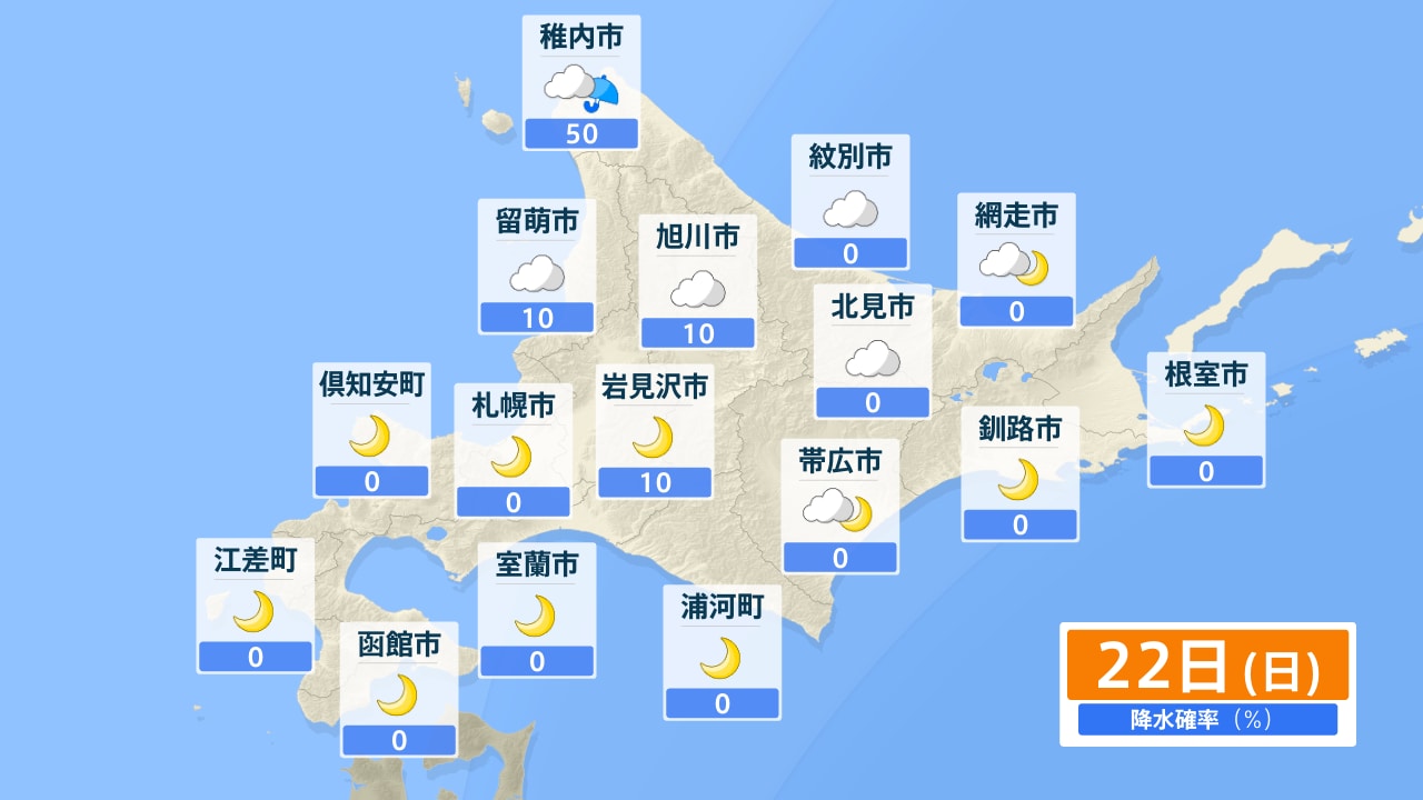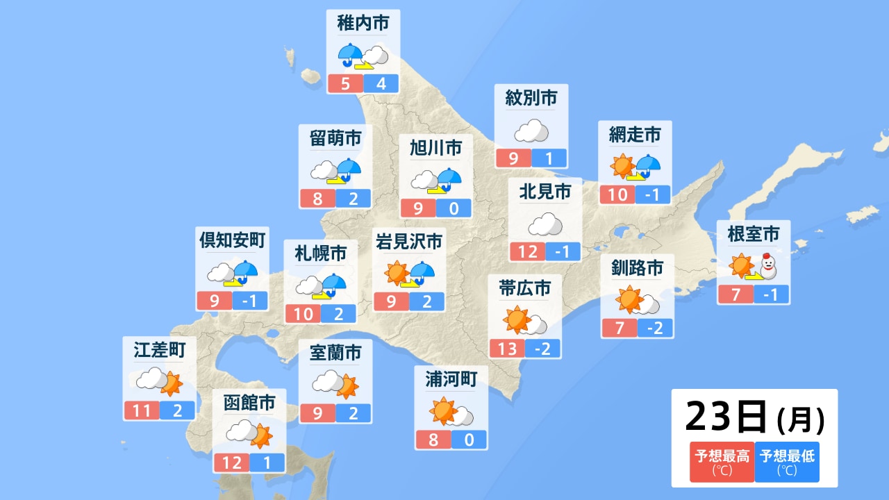 稚内市 留萌市 旭川市 紋別市 網走市 北見市 釧路市 帯広市 根室市 岩見沢市 札幌市 倶知安町 浦河町 室蘭市 函館市 江差町