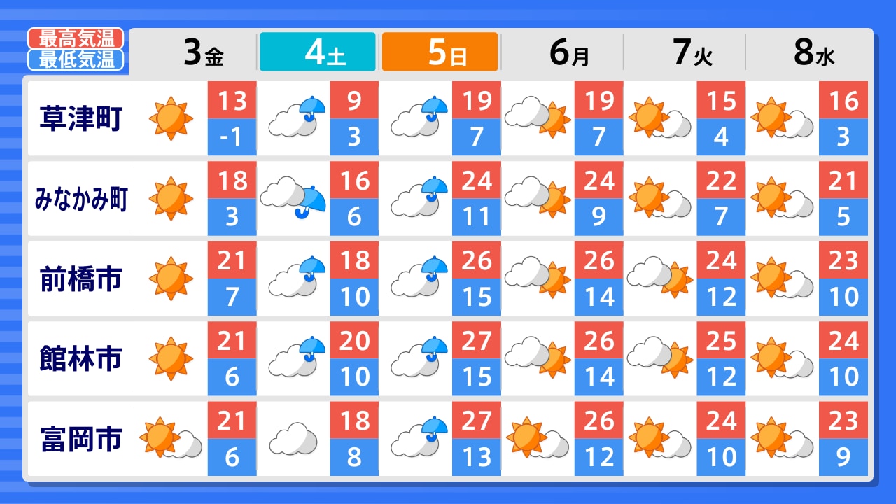 草津町 みなかみ町 片品村 渋川市 前橋市 桐生市 高崎市 富岡市 伊勢崎市 館林市