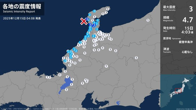 震度3 能登半島沖 04:03ごろ