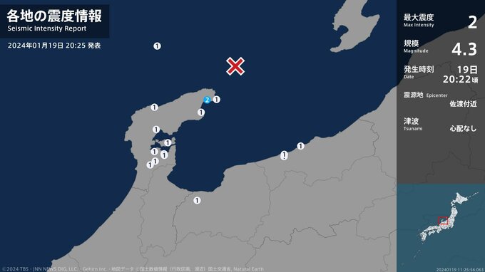 震度2 佐渡付近 20:22ごろ