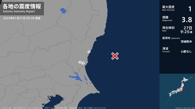 震度1 茨城県沖 09:26ごろ