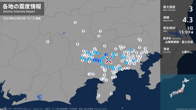 震度3 山梨県東部・富士五湖 15:09ごろ