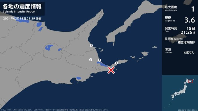 震度1 根室地方南部 21:26ごろ