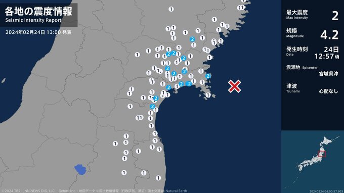震度2 宮城県沖 12:58ごろ