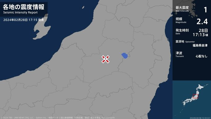 震度1 福島県会津 17:13ごろ