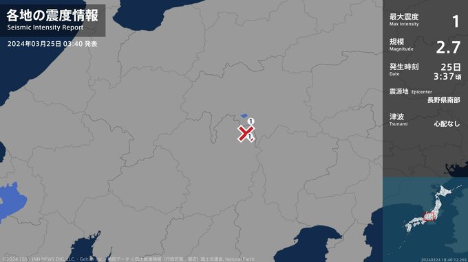 震度1 長野県南部 03:37ごろ