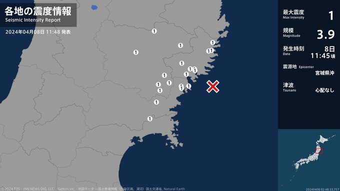 震度1 宮城県沖 11:45ごろ