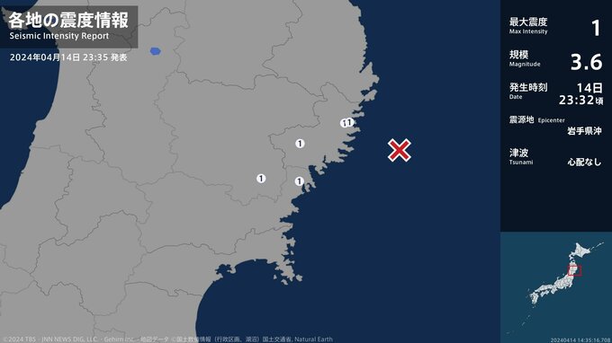 震度1 岩手県沖 23:32ごろ