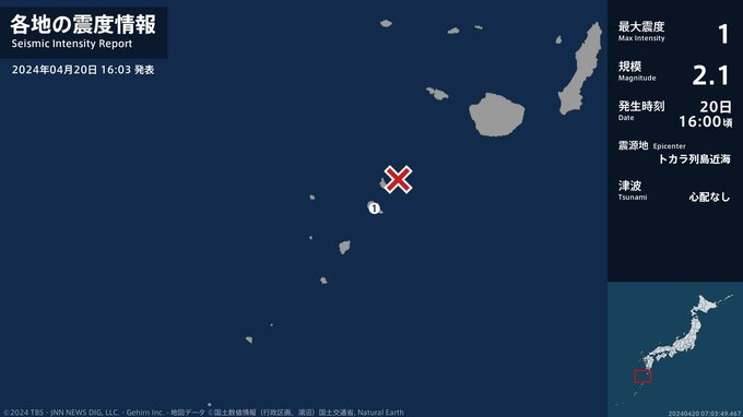 震度1 トカラ列島近海 16:00ごろ