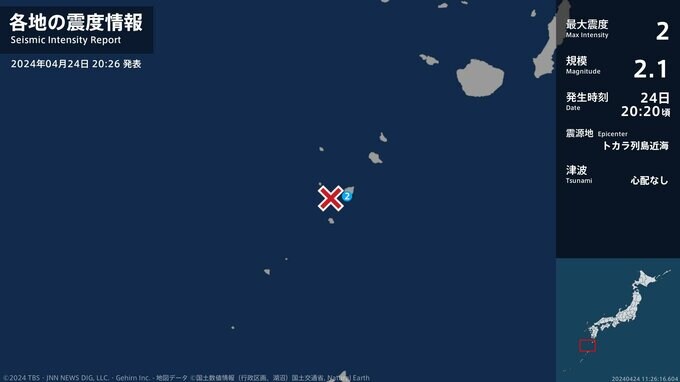 震度2 トカラ列島近海 20:20ごろ