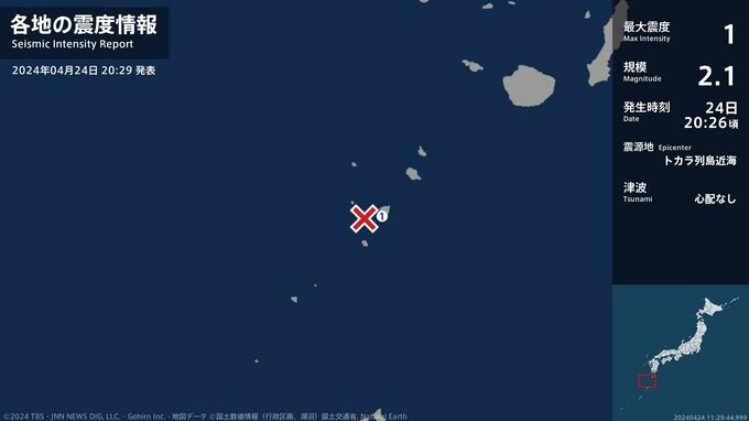 震度1 トカラ列島近海 20:26ごろ