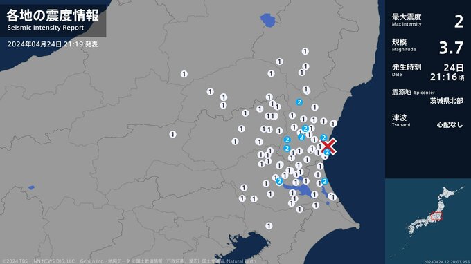 震度2 茨城県北部 21:16ごろ