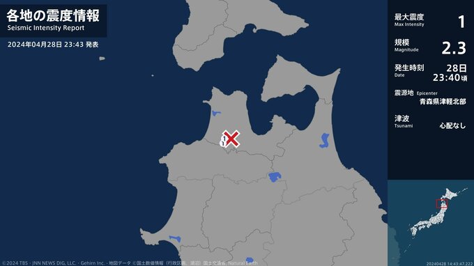 震度1 青森県津軽北部 23:40ごろ