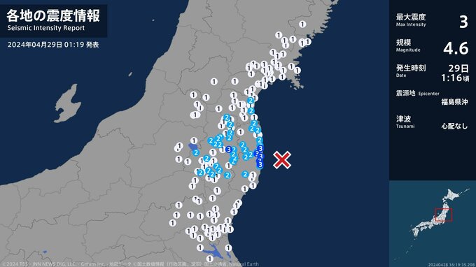 震度3 福島県沖 01:16ごろ