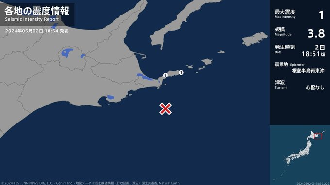 震度1 根室半島南東沖 18:51ごろ