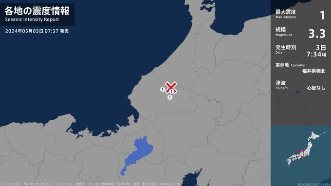 震度1 福井県嶺北 07:35ごろ